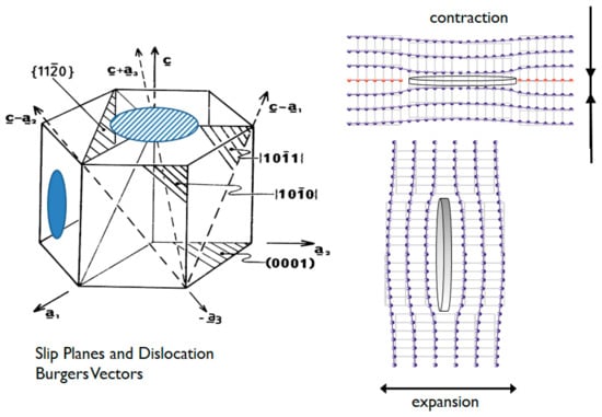 Schematic diagram of Zr-irradiated growth proposed by Buckley. A gap ring is formed on the {100} crystal plane, and a vacancy ring is formed on the substrate (0001) crystal plane [8] (Reproduced with permission from Elsevier, Amsterdam, The Netherlands).