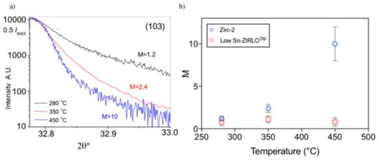 Effect of dipole properties of α-loops found in Zircaloy-2 protons irradiated at 280 °C, 350 °C and 450 °C (a) Half of the Ig_ (103) peaks can be seen at all three irradiation temperatures. These peaks have been normalised for tail comparison. The blue line represents the 280-degree Celsius sample, the red line represents the 350-degree Celsius sample and the black line represents the 450-degree Celsius sample. (b) Plot of Wilkens permutation parameters calculated with CMWP. The open blue circle represents Zircaloy-2, and the open red square represents the low-tin ZirloTM [28] (Reproduced with permission from Elsevier, Amsterdam, The Netherlands).