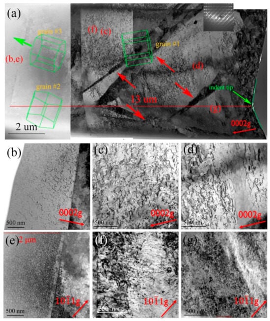 Deformation microstructures of the plastic zone created by indentation creep test at 300 °C on a proton irradiated sample. (a) Overall STEM image of the FIB sample; (b–d) STEM images acquired using the reflection g = (0002); (e–g) STEM images acquired using the reflection g = (101). The electron beam is close to the [110] zone axis [38] (Reproduced with permission from Elsevier, Amsterdam, The Netherlands).