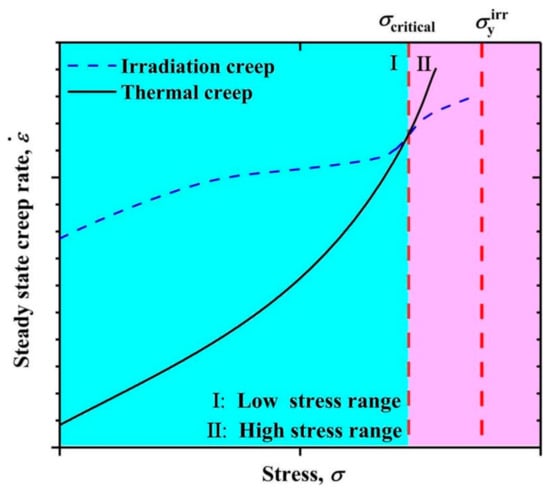 Schematic diagram of the steady-state creep strain rate of Zr alloy as a function of stress, where the critical stresses in the two regions are distinguished, which is the yield stress that has an irradiation effect [39] (Reproduced with permission from Elsevier, Amsterdam, The Netherlands).