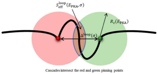 Schematic diagram of the displacement cascade unpinning behaviour under high stress. A solid black line indicates a dislocated screw. The red and green dots represent the two pinning points of the dislocation, which is also where the primary striking atom (PKA) is located. The effective blade grid is located at the intersection of two circles, which is the distance between the two pinning points, Rc() is the radius of the cascade region, and (σ,) is the effective intersection area [39] (Reproduced with permission from Elsevier, Amsterdam, The Netherlands).