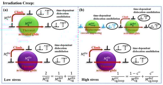 Schematic diagram of the basic deformation mechanism of irradiation creep [39] (Reproduced with permission from Elsevier, Amsterdam, The Netherlands). (a) low stress and; (b) high stress for irradiation creep.