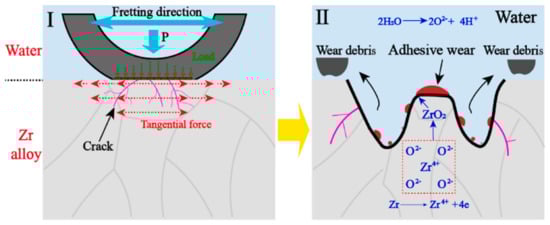 Schematic diagram of the oxidation corrosion mechanism of Zr alloy [51] (Reproduced with permission from Elsevier, Amsterdam, The Netherlands). (I) crack and plastic deformation are observed on the surface of Zr alloy because of the tangential stress.; (II) an amount of wear debris is generated and accumulated to form the wear debris layer.