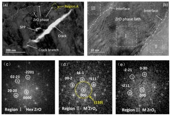 Microstructure of the zirconia phase in the oxide: (a) transmission electron microscope brightfield image, (b) high-resolution image of region A, and (c–e) FFTs in region I, region II and region III in (B), respectively [53] (Reproduced with permission from Elsevier, Amsterdam, The Netherlands).