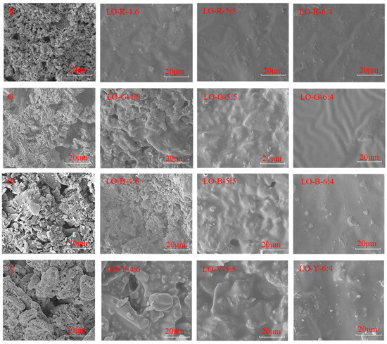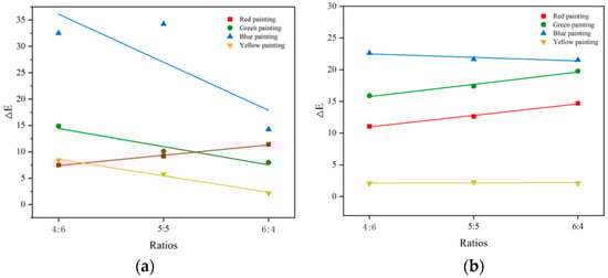 Figure 1 illustrates the color changes observed in oil-painted samples compared to the original pigment colors. Subfigure (a) shows the samples painted with Tung oil, while subfigure (b) displays those painted with linseed oil. Both oils result in noticeable color shifts, but the specific effects vary depending on the type of oil used. Furthermore, the extent of the color change also depends on the pigment color itself. When comparing the four pigments, the blue pigment exhibits the greatest color change, with a difference of over 15 units, and this color shift decreases gradually as the oil-to-pigment ratio increases. In contrast, the yellow pigment shows the smallest change, with color differences consistently under 10 units. This analysis highlights not only the distinct effects of Tung oil and linseed oil on color intensity and hue but also the varying impact these oils have on different pigments [33]. The results suggest that both the type of oil and the pigment’s nature play crucial roles in determining the final appearance of the painted surface [34].