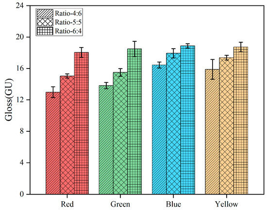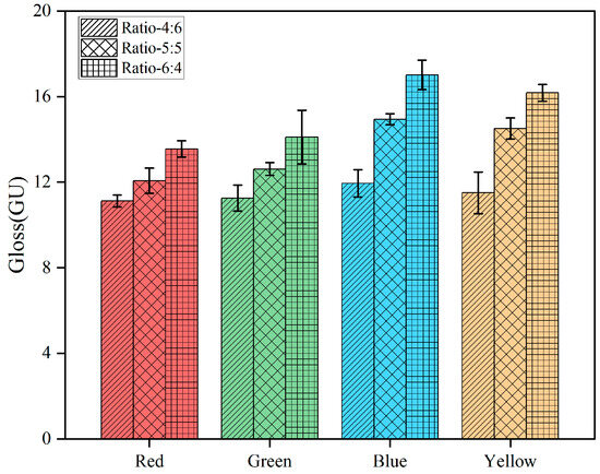 Gloss measurements were conducted according to GB/T 4893.6-2013 “Furniture Surface Paint Film—Physical and Chemical Performance Test—Part 6: Gloss Determination Method” [29], using a 3 μh Intelligent Gloss Meter (NHG268, Shenzhen, China) at a 60° incident angle. Three measurements were taken at the center of each specimen, with five specimens per group, and the average gloss value was calculated.