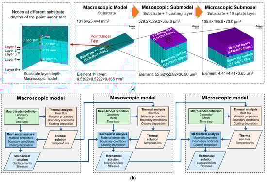 (a) Mesh used for the macroscopic, mesoscopic, and microscopic submodels, and detail of the layers and nodes at different depths of the point under test for the macroscopic submodel. (b) Sequence diagram of one-way coupled thermo-mechanical analysis between the macroscopic, mesoscopic, and microscopic submodels.