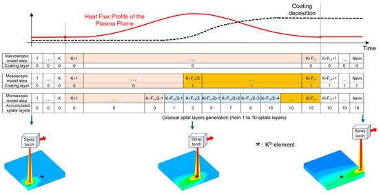 Before the plasma plume reaches the Kth substrate element, step K, the heat transfer is modelled as a convective and radiative heat flow from the substrate to the surroundings. When the plasma plume reaches the Kth substrate element, the heat flow is modelled as a forced convection flow [24]. At this step time, the coating element is activated at mesoscopic level. In the case of microscopic submodelling, the coating layer is divided into 10 successive splat layers that are activated during the plasma plume passage. The activation sequence of each of the ten layers is shown in Figure 3. Once the plasma plume leaves the deposited coating element, step K + FLx + 1, the heat transfer is modelled by the convective and radiative heat flow between the coating layer and the environment.