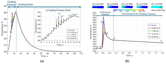 (a) Simulated temperature evolution at different substrate depths (0, 0.365, 1.0, 2.1, and 4.0 mm) of the point under test (Figure 1a) during the coating process with the macroscopic model. Inset (i) shows details of the simulated temperature evolution of the 15 trajectories of the full coating path, sx, x = 1, …, 15. (b) Simulated temperature evolution during the 8th trajectory at different substrate depths of the point under test and ANSYS’s temperature substrate images at different times: (A) tA = 6.433 s, (B) tB = 6.462 s, (C) tC = 6.498 s, (D) tD = 6.538 s, and (E) tE = 6.636 s.