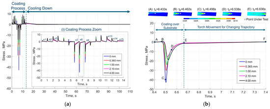 Figure 5a shows the stress evolution at different substrate depths of the point under test during the deposition and cooling phases of the entire APS coating process. There was a correlation between the temperature peaks of the plasma plume pass and the maximum peaks of the stress. The stress was due to the effect of the contraction of the substrate due to the heat provided by the plasma plume over an area of the plate. This generated compressive stresses in that area and tensile stresses on the rest of the plate. In the time interval from 0 s to 4 s, the plasma plume came into contact with the plate, producing tensile stresses at the point under test placed in the centre of the plate. The plasma plume passed over the centre area of the plate in the time interval from 4 s to 9 s and produced compressive stresses at the point under test. Finally, the plasma plume moved away from the upper edge of the plate in the time interval from 9 s to 14 s, generating tensile stresses at the point under test.