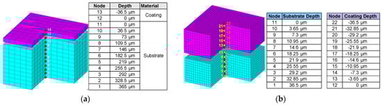 The difference in the scale between the coating thickness in micrometres and the substrate thickness, usually in centimetres, requires adaptive meshing to increase the accuracy in the region close to the coating layer. Two techniques are usually used. The first technique is to create a full adaptive mesh of the sample, varying the size and density of the mesh [12,14]. This method has the disadvantage of a large number of elements with a high computational cost.