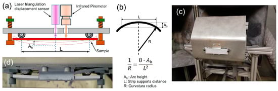 This section describes the experimental measurement of the quenching stress to validate the results obtained from the mesoscopic model for the APS coating process of Al2O3 coating on an aluminium substrate plate preheated to 300 K, point A in Figure 8a. An in situ curvature method based on continuously measuring the substrate curvature during the deposition process is proposed to measure the instant quenching stress. This non-destructive method allows for the direct calculation of residual stress from the curvature generated by a laser triangulation displacement sensor, and the substrate temperature measurement during the APS process through an infrared pyrometer. Several previous studies used the in situ curvature method to measure residual stress, and the thermocouple attached to the substrate to measure substrate temperature [36,37,38,39,40]. In contrast with previous works, the method proposed in this work allows for higher accuracy in non-contact temperature measurement, so it does not interfere with the curvature of the sample.