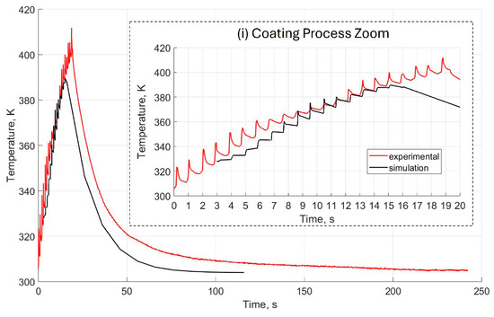 The thermal analysis validation of the macroscopic model was discussed in a previous paper [24]. Figure 12 compares the measured and simulated temperatures in the macroscopic model. The experimental test traced a total path of 21 trajectories to ensure complete coating on the aluminium plate. Only 15 trajectories were simulated, corresponding to the trajectories where the torch passed directly over the substrate. It was verified that the model predicted the measured temperature curve quite accurately. The difference between the experimental and simulated temperature was because the model did not consider the indirect heat flow from the plasma torch in the approach trajectories, and trajectories m1 to m3 and m19 to m21, as shown in Figure 11b. On the other hand, the temperature peaks when the torch passed over the plate were lower in intensity but longer in duration than those in the simulation. This was because the heat contributed by the gas flow parallel to the plate surface was not considered in the flame profile model.