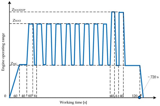 To replicate all the loads exerted on the turbine blades, an engine test was conducted for 52 h under test bench conditions according to the profile illustrated in Figure 1 [26]. Explanations to Figure 1: ZMG—idle speed, ZMAX—maximum speed, ZMAX DOP—maximum afterburning operation.