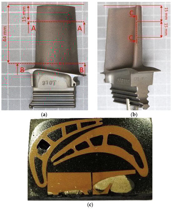Prior to the metallographic tests, the blades were cut according to the scheme shown in Figure 2 [26], and metallographic micro-sections were prepared.