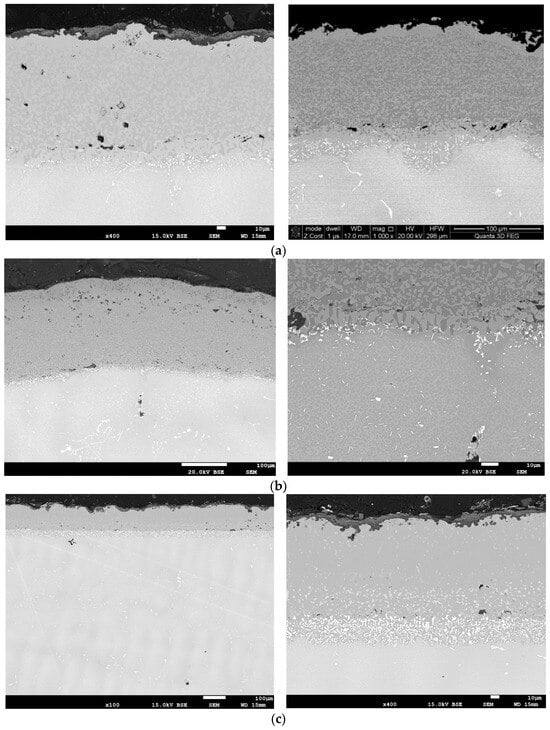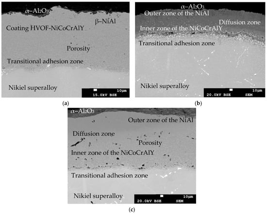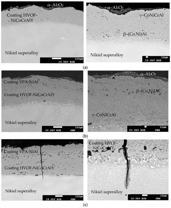 An example of the microstructure of the protective coating: (a) HVOF; (b) HVOF + VPA; (c) HVOF + SLURRY, after the heat treatment and shot-peening.