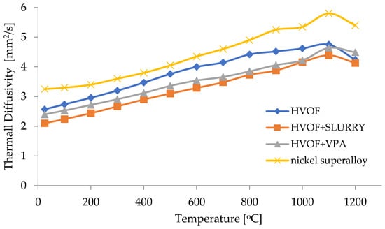 Thermal diffusivity of the blade material (nickel superalloy) of the engine turbine and coverings HVOF, HVOF + VPA, HVOF + SLURRY is shown in Figure 5.