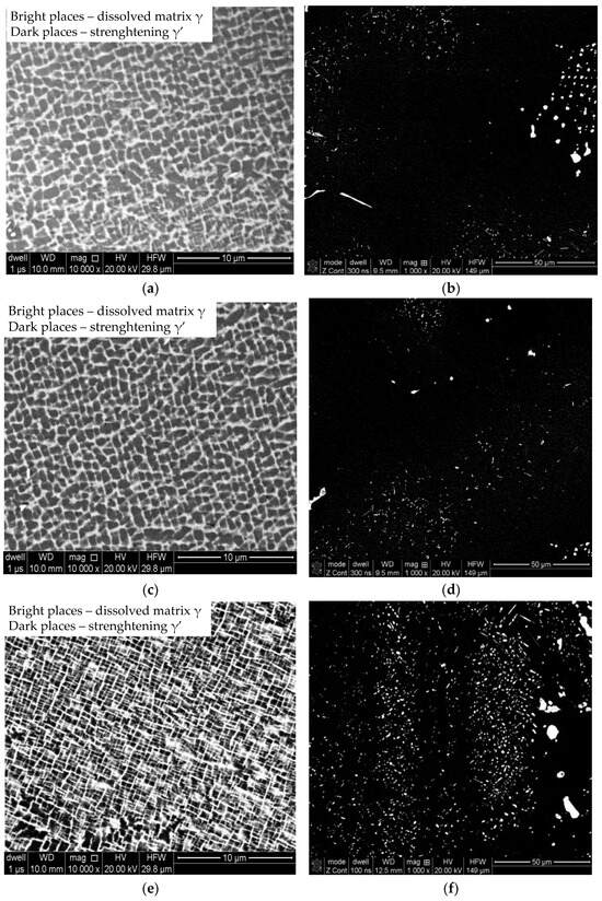 An example of the microstructure of the nickel alloy of the blade covered with a protective coating of the HVOF + SLURRY type after the engine test under test bench conditions is shown in Figure 9e,f. The blade material is characterized by a dendritic, two-phase structure built of cubic precipitates of the γ’ phase (Figure 9e) in the matrix of the γ solid solution with precipitates of M23C6 secondary carbides (Figure 9f). The microstructure of the base material of the blade includes a solid solution phase γ and an intermetallic phase γ’. In the dendritic two-phase structure of the blade material, the average size of cubic, reinforcing precipitates based on the structure of the Ni3Al (γ’) phase was estimated at 0.9 µm (Figure 9e), and the surface fraction of carbide precipitates, located mainly in the interdendritic areas γ + γ’, having a “Chinese script” morphology, was estimated at about 2.1%. The lack of thermal degradation of the structure of the native blade material is evidenced by small coagulated γ’ phase deposits and the lack of dissolution effect of finely dispersed γ’ phase deposits in the matrix of the γ solid solution. There was no clear shallowness (the so-called raft structure) resulting from the fusion of the reinforcing γ’ phase.