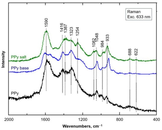 Raman spectrum of polypyrrole (PPy) prepared with “one-pot” synthesis in the absence of polyacrylate latex polymer compared with the spectra of the polypyrrole salt and base reported in the literature [].