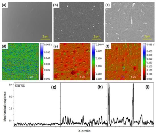 Fracture surface topography of the coating films obtained via SEM: (a) Lalkali_0, (b) Lalkali_0.25, and (c) Lalkali_0.50. Mechanical maps (below) determined via AFM for the coating films (d) Lalkali_0, (e) Lalkali_0.25, and (f) Lalkali_0.50. (g–i) Corresponding profiles of mechanical response.