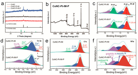 (a) The XRD pattern of the synthesized catalysts. (b) The XPS survey spectra and high-resolution XPS spectra: (c) Pt 4f, (d) Co 2p, (e) C 1s, and (f) N 1s of CoNC-Pt-IM-P, respectively.