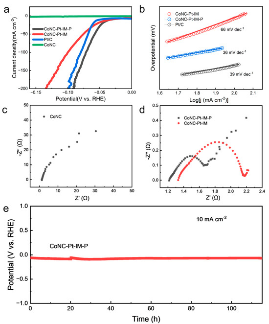The plasma treatment did not significantly alter the CoNC support or Pt loading amount, suggesting that it was the alloy formation that led to the significantly enhanced intrinsic catalytic activity. The electrochemical active surface area (ECSA) was characterized by measuring the double-layer capacitance (Cdl) of the catalysts within a non-Faradaic potential range. As illustrated in Figure S9, the Cdl of CoNC-Pt-IM-P (63.42 mF cm−2) was greater than that of CoNC-Pt-IM (35.15 mF cm−2) and CoNC (24.45 mF cm−2), indicating that CoNC-Pt-IM-P provided more HER active sites. The electrochemical impedance spectroscopy (EIS) results (Figure 3d,e) reveal that the charge transfer resistance (Rct) of CoNC-Pt-IM-P (0.47 Ω) was significantly lower than that of CoNC-Pt-IM (237.9 Ω) and CoNC (73.7 Ω), demonstrating its superior charge transfer capability. At −0.07 V, compared to the pristine CoNC (73.7 Ω), CoNC-Pt-IM-P displayed a much lower Rct (0.47 Ω), indicating minimal interfacial resistance and a faster charge transfer process. Moreover, to meet industrial application requirements, HER catalysts should not only possess outstanding catalytic performance but also exhibit good stability. As shown in Figure 4e, the chronoamperometric tests indicated that CoNC-Pt-IM-P could stably operate for over 110 h at a current density of −10 mA cm−2, demonstrating its excellent electrochemical stability [34,35].