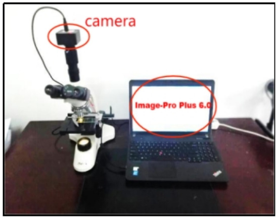 The particle size of the microcapsules was determined using fluorescence microscopy (FM, Phenix, Shangrao, China). First, the microcapsule samples were added to a test tube containing a small amount of anhydrous ethanol and dispersed using an ultrasonic disperser for 1 min until a homogeneous microcapsule–ethanol suspension was formed. Next, a small volume of the suspension was drawn onto a slide using a dropper and covered with a coverslip. The particle size was then observed and recorded using FM. Finally, the particle size distribution was quantified and statistically analyzed using Image-Pro Plus 6.0 (Media Cybernetics, Rockville Maryland, MD, USA), as shown in Figure 1.