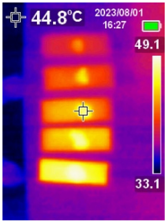 Next, the microcapsules were evenly distributed over an area of 1 cm2 on the slide and covered with a coverslip to prevent them from scattering and ensure that each group received the same area of microwave radiation in the microwave oven. The slides were then placed in a microwave heating cabinet for microwave heating. Finally, the infrared thermal images of the microcapsules were obtained using infrared thermography after the microwave heating, as shown in Figure 3.