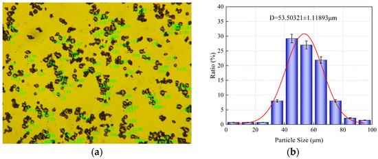 The results of the particle size distribution of the microcapsules are shown in Figure 5. As seen in Figure 5a, the microcapsules exhibited good dispersibility, with no obvious agglomeration. From Figure 5b, it can be observed that the particle size of the microcapsules followed a normal distribution, with a maximum particle size of 98.79 μm and a minimum particle size of 12.37 μm. The particle size of most microcapsules (86.13%) ranges from 42 to 76 μm, with an average particle size of 53.5 μm.