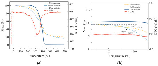 Mass loss of microcapsules. (a) is mass loss of microcapsules at room temperature to 700 °C; (b) is enlarged view of mass loss of microcapsules at room temperature to 300 °C.