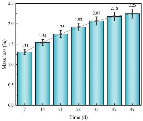Figure 10 demonstrates the variation in the mass loss of microcapsules over different storage periods (7 d, 14 d, 21 d, 28 d, 35 d, 42 d, and 49 d). The fastest mass loss of microcapsules was observed during the first 7 days, due to the small amount of uncondensed H3M molecules and water on the surface of the microcapsules, which volatilized rapidly into the air [39]. The mass loss of the microcapsules gradually increased with the extension of the storage time. This may be due to the prolonged storage resulting in exposure of the shell material to air oxidation [24]. In addition, the regenerant may also be exposed to air infiltration through weak portions of the shell and slowly volatilize, further contributing to the mass loss of the microcapsules. As the storage time continued to increase, the mass loss rate of the microcapsules decreased and gradually stabilized (with a 2.25% mass loss after 49 d), indicating that the microcapsules have good storage stability [40].