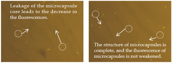 To investigate the construction stability of the microcapsules, FM was used to observe their morphology in asphalt mixture extracts. Asphalt mixtures were prepared at 130 °C and 160 °C with 6% microcapsules. The results are shown in Figure 11. It was found that most of the microcapsules maintained an intact structure with no leakage of the core material after mixing and compression at 130 °C and 160 °C. In addition, a few microcapsules retained their intact circular morphology, although the internal core material was prone to leakage, causing the fluorescence of the microcapsules to be significantly reduced under FM.