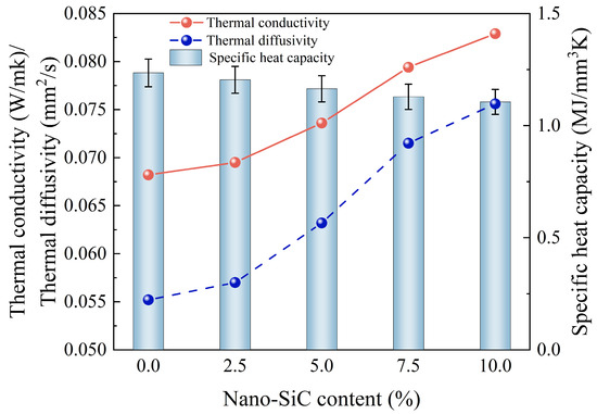 To investigate the effect of different nano-SiC contents on the thermal conductivity of microcapsules, microcapsules with different nano-SiC contents (0%, 2.5%, 5%, 7.5%, and 10%) were tested using a hot plate thermal constant meter. The results are shown in Figure 14.
