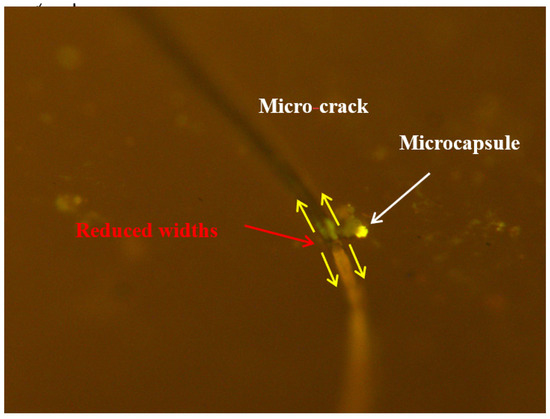 To investigate the self-healing behavior of the stress dual-induced nano-SiC-modified microcapsules, fluorescence microscopy was used to observe the state of microcracks in asphalt with a 6% microcapsule content. Under the fluorescence microscope, the asphalt and regenerant agents emit deep orange and yellow-green fluorescence, respectively, allowing observation of the distribution of the regenerant agents around the cracks.