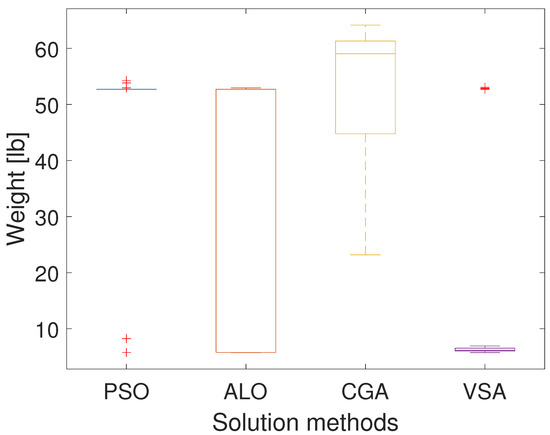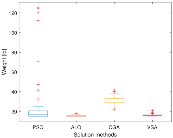 The box plots show that ALO and VSA achieved superior performance with lower median weights and narrower interquartile ranges, indicating more consistent results. ALO had a median weight around 15.5 lb, while VSA had a median around 16.4 lb. In contrast, CGA showed a wider spread with a median weight around 31 lb, and PSO exhibited the largest variability, with weights ranging from approximately 73 lb to over 236 lb.