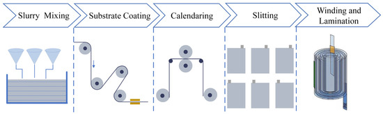 The electrode sheet is a key component of lithium batteries, and its production represents the first stage in the overall manufacturing process of lithium batteries. The typical manufacturing process for LBEs involves the following steps: the active material, binder, and conductive agent are mixed to prepare a slurry, which is then coated onto both sides of a copper or aluminum current collector. After drying, the electrode coating is compacted through roller pressing, followed by cutting or slitting into the required dimensions. Finally, the positive electrode sheet, separator, and negative electrode sheet are wound in a specific order using a fixed winding needle and compressed into cylindrical, oval, or prismatic shapes, as shown in Figure 1 [19].