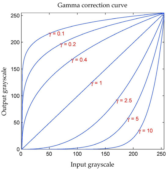 where Io(aij) represents the grayscale value of a pixel in the original image, [Io(aij)]max denotes the maximum grayscale value in the original image, and IG(aij) is the output pixel grayscale value after Gamma correction. The parameter γ determines the shape of the transformation curve. The relationship between these values is illustrated in Figure 3. When γ < 1, the grayscale values of the image increase, leading to an overall increase in brightness and enhanced contrast. Conversely, when γ > 1, the grayscale values decrease, resulting in an overall darker output.
