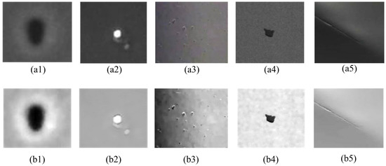 Enhancement effect images of the defect images. (a1–a5) Original images of the coating defects; and (b1–b5) enhanced images based on the improved Gamma correction.