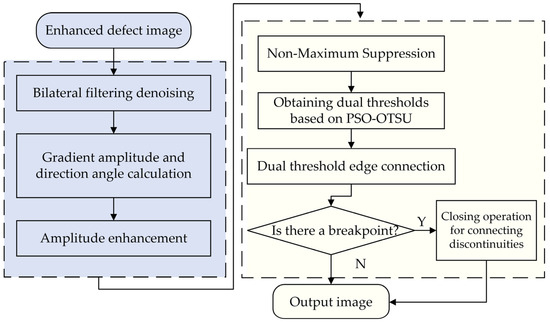 To address the limitations of the traditional Canny algorithm, improvements are proposed in this paper. First, bilateral filtering is used instead of Gaussian filtering to preprocess the defect images, solving the problem of edge blurring caused by Gaussian filtering. To capture edge gradient information from multiple directions, 45° and 135° Sobel gradient templates are added, and four-direction convolution operators are applied to the image. Secondly, PSO-OTSU is employed to adaptively determine the high and low threshold values for defect segmentation, resolving the issue of poor adaptability with fixed thresholds. Finally, morphological closing operations, including dilation followed by erosion, are applied to the detected edge images, further refining the segmentation of the target defects. A flowchart of the defect segmentation process is shown in Figure 5.