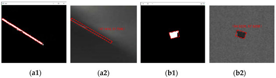 After improving the Canny operator and applying morphological processing, accurate segmentation of the defect regions has been achieved. However, further processing is required to perform contour detection and labeling on the segmented defect images in Figure 6, allowing technicians to visually observe the results of the detected coating defects on the electrode sheet surface, thus completing effective detection of the coating defects. Additionally, after contour detection and labeling, the algorithm provides information such as the number of detected defects, along with the coordinates, width, height, and rotation angle of each defect. This information allows for the retrieval of the corresponding original grayscale images and shape features of the defects, laying the groundwork for subsequent feature extraction tasks.