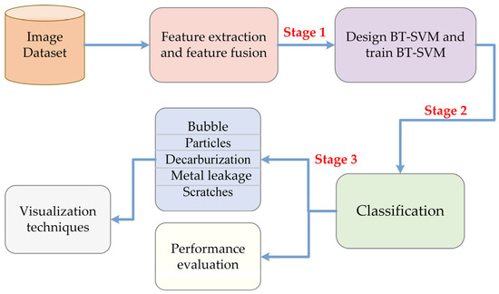 The defect classification procedure for the LBE coating in this study primarily utilizes pattern recognition and machine learning techniques. The general process is as follows: First, features are extracted from the defect image data. These extracted features are then fused and used as input for training the classification model. Once the model is trained, it can classify the defects. A flowchart of the defect classification system is shown in Figure 8.