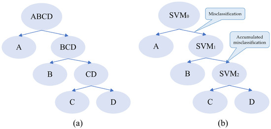 A Binary Tree Support Vector Machine (BT-SVM) addresses multi-class classification problems by constructing multiple binary classifiers. The main idea is to divide all classes into two subgroups and then perform binary classification on each subgroup. As shown in Figure 9a, this process is repeated iteratively until all subgroups are separable [29]. During classification, BT-SVM avoids the issue of inseparable regions, which improves classification accuracy. Additionally, it requires constructing only k − 1 binary classifiers, reducing training time. However, the performance of the classifier is more influenced by the upper nodes of the decision tree, with misclassifications more likely near the root node, leading to a more significant accumulation of errors, as shown in Figure 9b. Therefore, it is crucial to ensure that each node in the decision tree maximally separates one class from the others during the tree generation process.