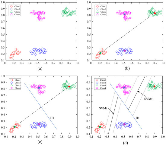 If G_ Cp or G_ Cq contains only one class, a terminal node is created. At the terminal node, classification decisions are made using an SVM, and the training set associated with this node is constructed from the samples of both groups, rather than solely from the centroids. When a test sample traverses from the root node to the leaf node of the binary split tree, the classification task is completed. As shown in Figure 10d, the final classification decision is made using an SVM, where SVM1 separates Class1 and Class2 and SVM2 separates Class3 and Class4.