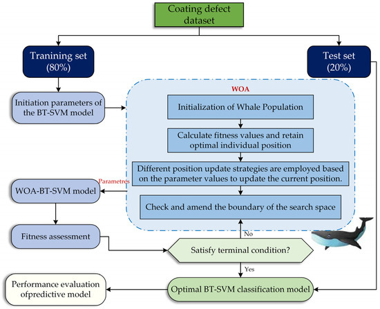 Figure 11. Schematic diagram of WOA-optimized BT-SVM classification model.