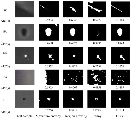 The simulation experiment was conducted based on the surface defect detection algorithm for extreme film coating. The detection accuracy for defects was 0.2 mm, with the minimum detectable defect size being six pixels. A total of 500 defect images, including 100 images each for scratch, bubble, metal leakage, particle, and decarbonization defects, were used for detection after data augmentation. The detection results and algorithm running times were compared among the maximum entropy threshold segmentation, the region growing method, the traditional Canny algorithm, and the improved Canny algorithm presented in this paper; the partial detection results are shown in Figure 12. After multiple experiments, the best detection performance was achieved using a segmentation threshold of (120, 55) and a bilateral filter template size of seven for the improved Canny algorithm.