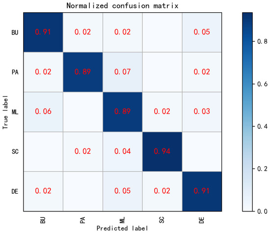 To provide a clearer understanding of the classification model’s performance on the five defect categories, the classification results are presented in the form of a confusion matrix. The total of each row in the matrix represents the actual number of samples for that category, while the total of each column represents the number of samples predicted for that category. The confusion matrix is shown in Figure 13.