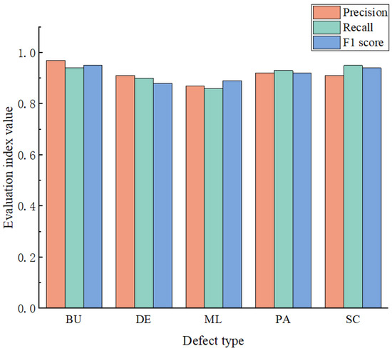 The average precision for the classification of various defects is 93.0%, the recall is 91.6%, and the F1 score is 92.6%. The proposed classification model performs well in classifying defects such as scratches and bubbles, while the classification performance for metal leakage defects is somewhat less satisfactory.