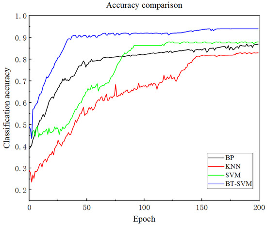 To further validate the performance of the classification algorithm proposed in this paper, a comparison is made with the BP neural network, decision tree, and SVM classifiers. The experimental results are shown in Figure 15. The classification accuracy of the BT-SVM model reaches 95.6%, which is significantly higher than that of the other classification algorithms.