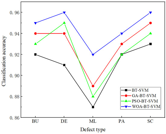 To validate the superior performance of the WOA algorithm, a comparison is made with two classic parameter optimization algorithms: a Genetic Algorithm (GA) and a Particle Swarm Optimization (PSO). The classification accuracy of different types of defects using different classification methods is shown in Figure 16, and the average classification accuracy is shown in Figure 17.