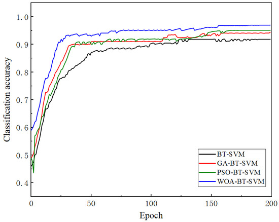 During the training and testing of the defect classification model, 400 defect data samples were allocated as the training set to train the BT-SVM, and 100 defect data samples were used as the testing set to evaluate the classification accuracy. The population size was set to 30, with a maximum of 200 iterations. After optimization using Whale Optimization, the best parameters were found to be C = 38.64 and γ = 0.95.